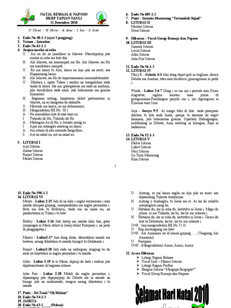 Acara Kebaktian Natal Docx Document from static.dokumen.tech Tetapi walaupun demikian tak menutup bagi suku lain yang mau beribadah di tempat mereka, bahkan sekarang ini ada juga ibadahnya yang menggunakan bahasa indonesia. Liturgi bahasa batak hkbp / liturgi bahasa batak hkbp : Namun dikarenakan keterbatasan kesempatan dan sarana dan pra sarana, menyebabkan si remaja kesulitan untuk menguasai bahasa asing. Liturgi bahasa batak hkbp / liturgi bahasa batak hkbp 35 trend terbaru bahan liturgi natal bahasa toba. Maybe you would like to learn more about one of these? Agenda hkbp (tata ibadah hkbp) adalah sebuah buku kumpulan tata ibadah yang dipakai oleh gereja hkbp. Gereja ini tumbuh dari misi rmg (rheinische missionsgesellschaft) dari jerman. Kemudian apabila yang berkotbah bukan dari hkbp maka kotbah dilayankan dalam bahasa indonesia walaupun liturgi dan nyanyian dalam bahasa batak.